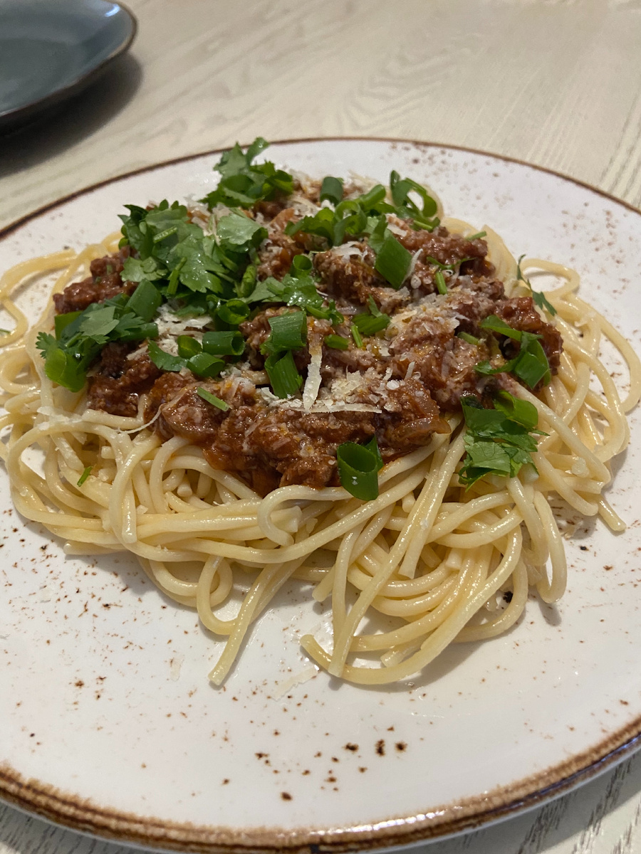 Если вы не любите макароны, то приготовьте эту пасту и без заморочек получите превосходный результат! Базовые ингридиенты этого рецепта есть почти в каждом доме: Фарш (Телятина или свинина на ваш вкус) - 500г Томаты измельчённые - 250г Лук - 2 шт средних Чеснок - 4 зубчика Спагетти - 400г Сыр пармезан - 100г Масло оливковое для жарки Зелень ( кинза, зелёный лук) Специи, соль, перец - по вкусу Если фарш заморожен, заранее размораживаем. Чистим лук, чеснок. Лук режем полукольцами, чеснок произвольными не очень мелкими кубиками-брусочками. На разогретом масле, на среднем огне обжариваем минутку чеснок, добавляем лук и обжариваем ещё примерно 5 минут. Добавляем фарш, перемешиваем, ждём пока фарш приобретёт естественный цвет готового мяса, перемешиваем ещё несколько раз, пока от крови не останется и следа. Солим, перчим, добавляем приправы. Я люблю французские травы, поэтому добавляю их. Выкладываем в сковороду томаты, тушим 5 минут, добавляем пол-стакана воды, тушим ещё 5-7 минут. Пока ту