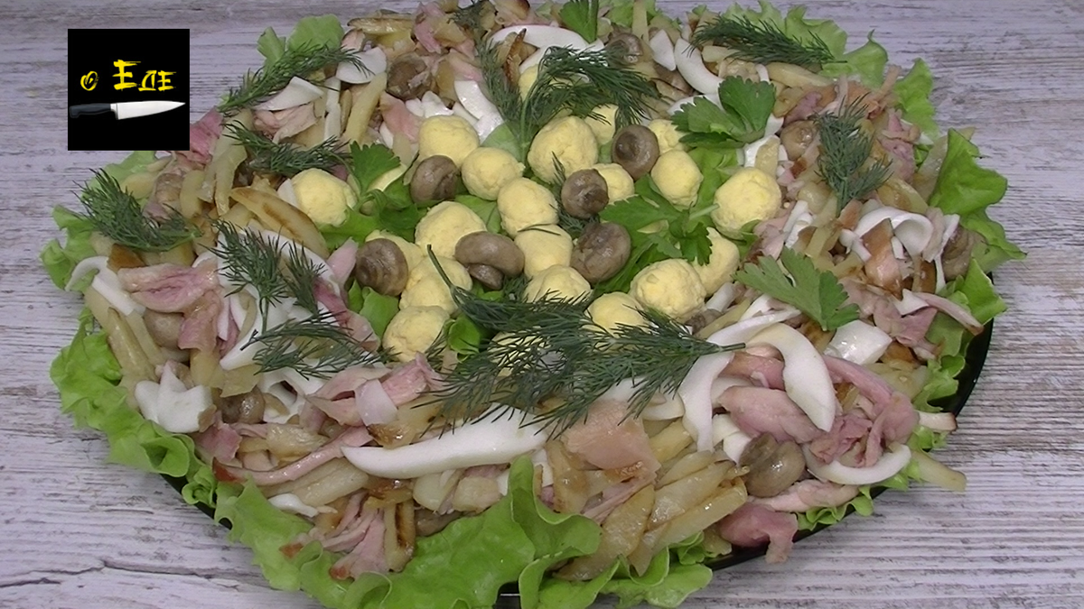 В этом видео приготовим салат из жареной картошки.Можно как основное блюдо на ужин так как салат с жареной картошкой довольно сытный и как блюдо на ужин очень вкусно просто на скорую руку.Ещё этот салат называют салат глухариное гнездо или просто гнездо глухаря. Итак салат гнездо глухаря рецепт -Картофель-900г -Грибы-200г -Лук-1/2 -Масло сливочное-50г -Яйцо-7шт -Майонез-3ч.л. -Чеснок-2 зубчика -Окорочёк копчёный-3шт -Листья салата -Соль по вкусу -Укроп, петрушка Пошаговое описание в видео