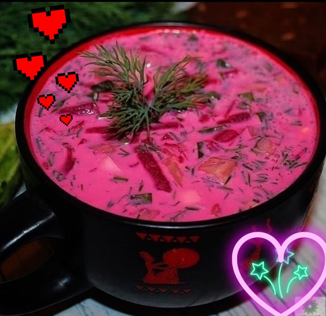 ХОЛОДНЫЙ БОРЩ ПО СТАРИННОМУ РЕЦЕПТУ Ингредиенты: -вареная свекла-3 шт. -яйца вареные-4 шт. -огурцы свежие-3 шт. -лук зеленый- 1 пучок -укроп свежий- 1 пучок -кефир 1 %- 1 литр -сметана 15%- 3 ст. л. -стакан воды -соль, перец Приготовление: 1) Трем свеклу на крупной терке; 2) Огурцы, яйца режем кубиком; 3)Режем лук, укроп; 4) Солим, все перемешиваем, добавляем кефир, воду и снова перемешиваем; 5) Ставим в холодильник на часок, а потом наслаждаемся в такую жару легким, сытным, вкусным супчиком! Холодный борщ по старинному рецепту!