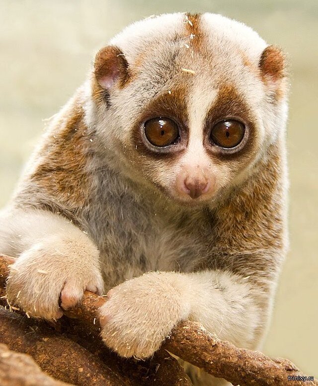 Это животное, размером с меленькую кошку обитает во влажный тропических лесах Азии и Индонезии и живет исключительно на деревьях. У лори густая, мягкая шерсть, коричневого или серого окраса и светлая мордочка. И это единственный вид ядовитых приматов. Яд Толстого лори способен вызвать удушье и смерть даже у человека, не говоря уже о мелких животных. Но яд нужен им не для охоты, а для других нужд. Втертый в мех, он служит отличной защитой от паразитов. Так же ученые предполагают, что яд лори может использовать как средство видового опознания, и с помощью него примат метить территорию. И еще как гипотеза, есть мнение, что развитие ядовитых желез может быть связано с мимикрией (подражанием) – считается что яд, черные «очки» вокруг глаз и шипящий звук, который они издают при опасности, делает Толстого Лори похожим на очковых змей. Толстый лори ночное животное, днем он спит, свернувшись клубком на ветке дерева, в ночью выходит на охоту. В его рацион входят насекомые, мелкие птицы, смола де