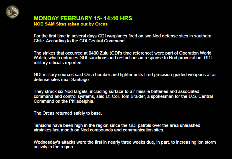 Примечание - Это мой неофициальный перевод вымышленных новостей, связанный с Command & Conquer: Tiberian Sun. Ссылка на оригинальный архив. Установки ПВО NOD были уничтожены Орка Впервые за несколько дней военно-воздушные силы GDI обстреляли два оборонительных объекта NOD на юге Чили. По данным Центрального Командования GDI. Как сообщили военные официальные лица GDI, удары, которые произошли в 04:00 Зулу (отсчет времени GDI), были частью Операции Мировой Дозор, которая вводит санкции и ограничения GDI в ответ на провокации NOD. Военные источники GDI сообщили, что подразделения бомбардировщиков и истребителей Орка обстреляли объекты противовоздушной обороны вблизи Сантьяго из высокоточного оружия. По словам лейтенант-полковника Тома Брейдера, пресс-секретаря Центрального Командования на "Филадельфии", они поразили шесть целей NOD, включая батареи зенитно-ракетных комплексов и связанные с ними штабы командования. Орка благополучно вернулись на базу. Напряженность в регионе выросла с тех