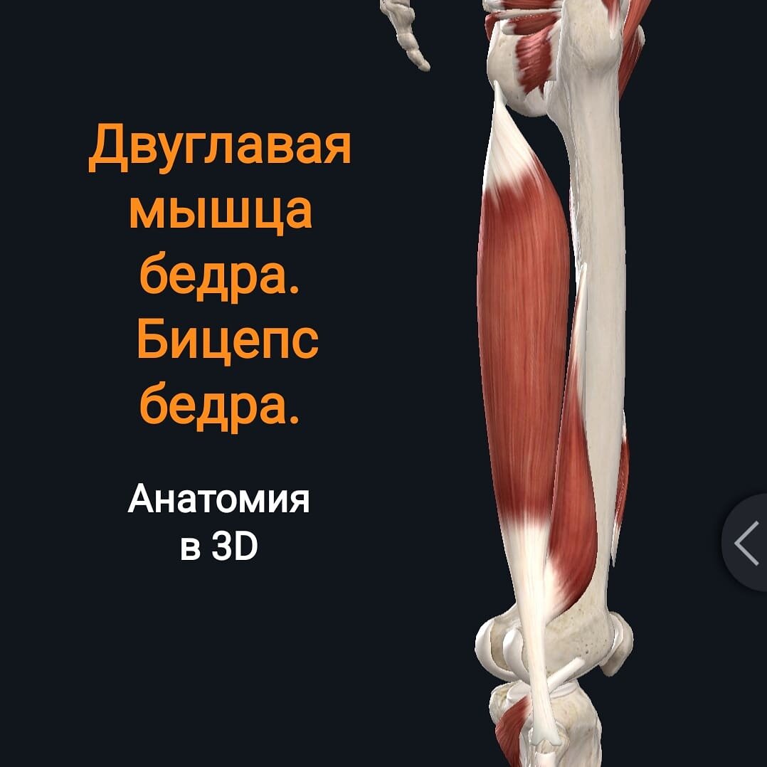 Бицепс бедра или двуглавая мышца - относится к хамстрингам, мышцам задней поверхности бедра. Мышцу условно можно разделить на 3 части: длинную головку, короткую коловку и сухожилие. Функции: - придаёт заднюю устойчивость тазу; - обеспечивает стабильность коленного сустава и его ротационную устойчивость; - сгибает колено; - разгибает бедро. Анатомия: Длинная головка ТН: седалищный бугор вертви седалищной кости. ТП: латеральная поверхность головки малоберцовой кости. Короткая головка ТН: шероховатая линия и латеральная надмыщелковая линия бедренной кости. ТП: латеральная поверхность головки малоберцовой кости. Иннервация: Длинная головка - большеберцовый нерв (L5-S1). Короткая головка - общий малоберцовій нерв (L4-S1) Кровоснабжение: Медиальная артерия, огибающая бедренную кость, нижняя ягодичная артерия, прободающие артерии глубокой артерии бедра. Антагонист: 4-х главая группа мышц бедра. Синергисты: полусухожильная, полуперепончатая, портняжная, тонкая, подколенная, икроножная и п