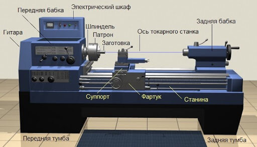 Токарные станки по устройству, практически, все одинаковые. И сейчас я "разберу по запчастям" показаный станок на картинке. Основа токарного станка это - СТАНИНА, от качества её изготовления зависит множество факторов: это жесткость станка, точность обработки, долговечность. Станина покоится на двух ТУМБАХ. В передней тумбе находится электродвигатель главного привода, а в задней резервуар для смазывающе охлаждающего технологического средства (сотс), в народе - эмульсия либо вода. Над передней тумбой находится - ПЕРЕДНЯЯ БАБКА, в ней расположена коробка скоростей и коробка подач, также, гитара сменных колёс для передачи вращающего момента от коробки скоростей к коробке подач. В передней бабке также находится ШПИНДЕЛЬ - главный ведомый вал станка, на передний конец которого устанавливаются станочные приспособления для закрепления заготовок. На направлющих станины установлен СУППОРТ. Он состоит из трёх кареток: продольной, поперечной и верхней. В
