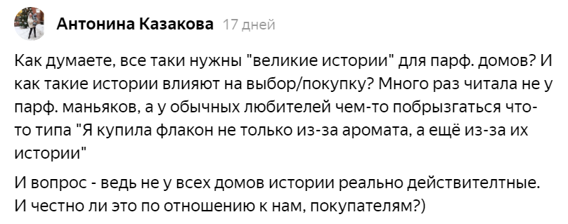 Зачастую покупатель приобретает парфюм не только из-за понравившегося аромата, но и потому, что выпустил его известный модный дом с красивой историей. Об этом вопрос подписчицы Антонины: В одном вопросе заложено две темы: 1. "Сторителлинг в парфюмерии" и 2. "Дома с историей". Попробуем захватить обе и не запутаться. 1. Сторителлинг в парфюмерии Важнейший способ восприятия информации у человека - визуальный. Иногда аудиальный. То есть у обонятельных рецепторов подавляющего большинства людей мало шансов повлиять на выбор аромата. Нос - такой себе конкурент глазам и ушам. В первую очередь потенциальный покупатель заметит цвет и форму флакона, цвет жидкости, прочтет или услышит легенду аромата и дома, а уже потом задастся вопросом - чем на самом деле пахнет. И если глазам понравилось красочное оформление, а уши сочли описание вдохновляющим, то высока вероятность, что аромат понравится и носу. Вот что пишет об этом Анна Зворыкина: "...если один и тот же раствор простого душистого вещества л