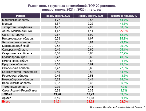 В январе-апреле 2021 г. на российском рынке продано 28,92 тыс. новых грузовиков, что на 32,0% больше, чем в АППГ. Лидером среди региональных рынков в январе-апреле 2021 г. стала Москва, где продажи новых грузовиков составили 2,56 тыс. ед. (+44,7%). Далее в рейтинге следуют Московская область и Республика Татарстан. На фоне общего роста региональных рынков новых грузовых автомобилей Ханты-Мансийский автономный округ продемонстрировал отрицательную динамику продаж (-22,7%). https://www.napinfo.ru/press-releases/prodazhi-kommercheskoy-tekhniki-v-aprele Пожалуйста, оцените эту статью и подпишитесь на канал или поделитесь ссылкой на него в социальных сетях, если считаете его интересным.