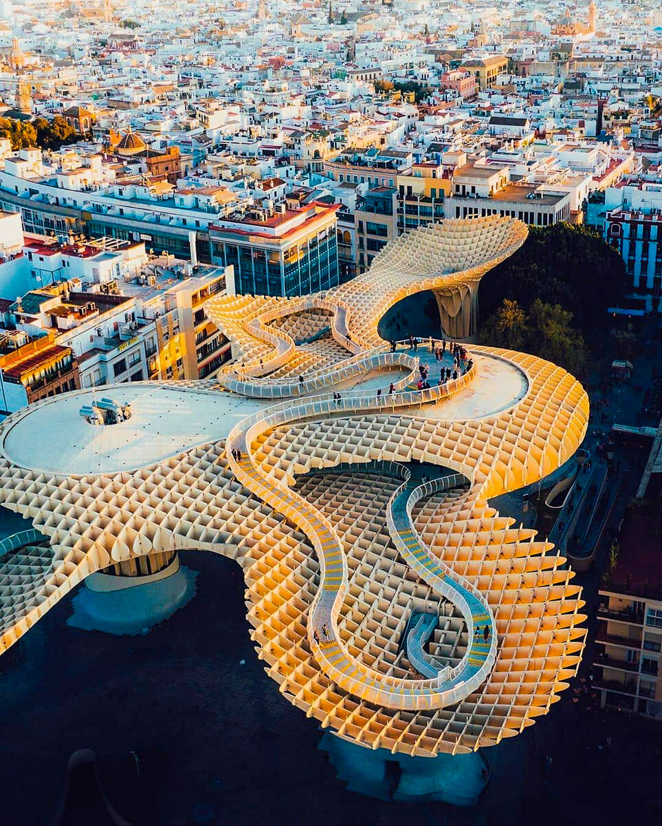 Сложно объяснить, что это такое, лучше начать с истории возникновения объекта. Изначально на площади Plaza de la Encarnacion в городе Севилья располагался городской рынок, но в 2005 году было решено его снести и построить парковку, где при строительстве наткнулись на римские и мавританские руины. Администрация города решили сохранить останки исторических зданий и провели конкурс, который выиграл архитектор Йорген Майер-Херманн. В 2011 году закончили строительство, теперь на минус первом уровне находиться музей, а на нулевом, на улице, как был и раньше - рынок. На последующих уровнях - площадки под мероприятия, и смотровая площадка на самом верхнем. Эта конструкция из дерева, состоящая из 6 гигантских зонтиков, размерами 150 на 70 метров и высотой около 26 метров. Сейчас это самая большая деревянная постройка в мире, хотя присутствуют металические и бетонные элементы.