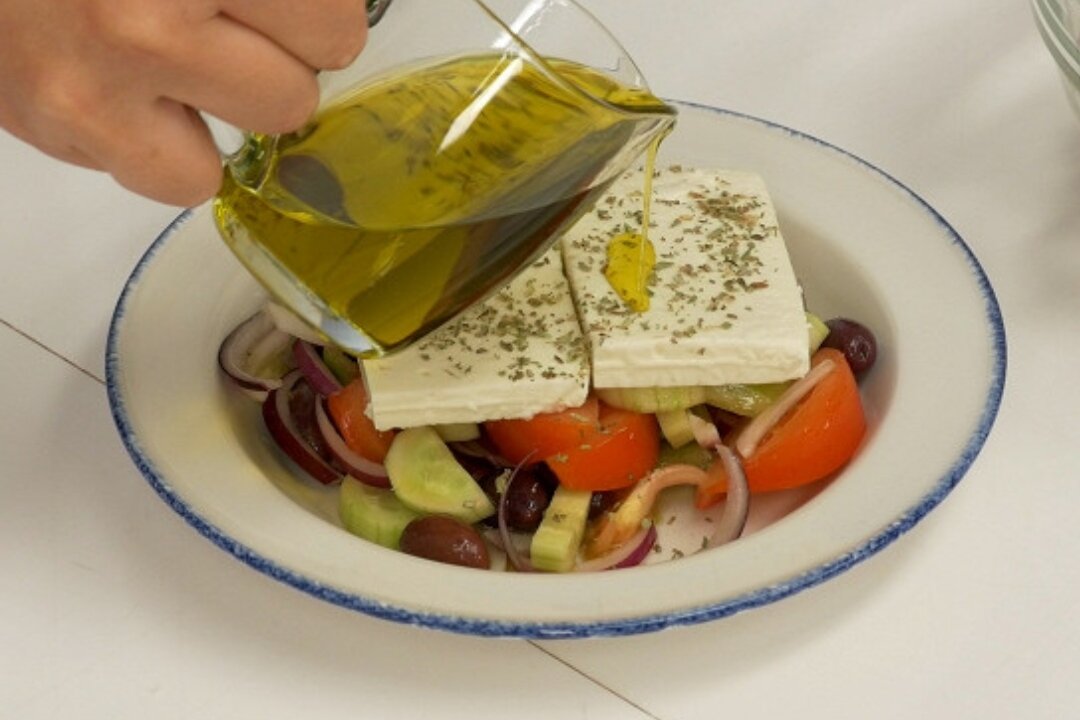 - 7. Еще раз перемешать овощи в салатнике и разложить по тарелкам. Сверху на каждую порцию выложить по два ломтика феты. Щедро полить оливковым маслом.