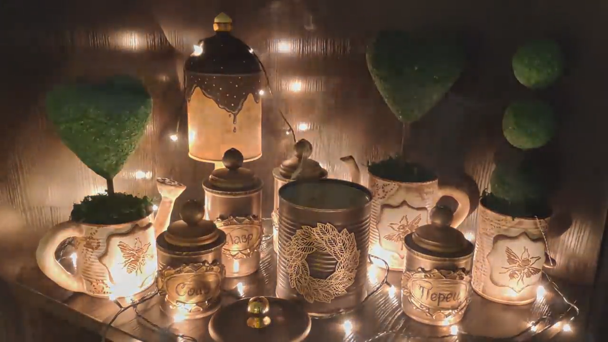 Здравствуйте, дорогие друзья и гости канала Семейный handmade. Сегодня мы продолжаем, покажу вам ещё один вариант, как можно повторно использовать консервные банки. В результате вы получите не только стильный и красивый декор, но и вполне себе функциональные предметы интерьера. В прошлой статье я показала, как сделать кашпо в виде лейки, чайничка и ведёрка. Сегодня это органайзеры для съедобного или несъедобного, выбирайте на свой вкус. Приступим к работе. В этот раз я использовала банки от оливок и маленькие баночки от горошка. Банки грунтуем и сушим. Делаем рамочки. И теперь я буду использовать для этой цели молд. Заполняем молд массой для лепки, промазываем клеем ПВА, чтобы после высыхания массы бирочка хорошо держалась, и приклеиваем к банке. Больше фото в галерее, листая по стрелке вправо. После полной просушки можно раскрасить баночки на свой вкус. Я раскрашиваю акриловыми красками в коричнево-золотой гамме. Чтобы сделать цвет более плотным, первый слой краски я нанесла на баноч