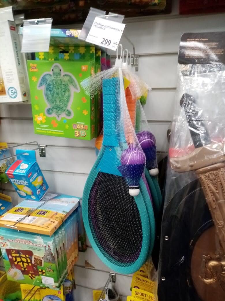 На первый взгляд выполнен добротно. В набор входит: две ракетки размером 54х26х2,5 см, воланчик и мячик. Цена 299 рублей.