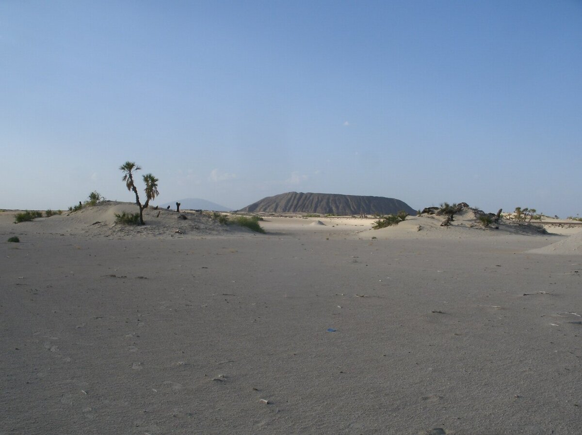 В пустыне пейзаж не изобилует разнообразием, разве что песчаные просторы сменяются каменистыми. У источников воды пустынный ландшафт несколько оживляется. Очередная ночевка – в поселке Hamede Ela. Ужин вместе с приблудившейся козой и сон на открытом воздухе. Редкие очаги цивилизации: И тем не менее, даже в таких местах живут люди. Наш гид и водители, обеспеченные по эфиопским меркам люди, привозят для детей тетрадки и ручки. Жаль, что нас не предупредили, а что-то другое (деньги, еду) гид попросил не давать - не хотят, чтобы Эфиопия превратилась в страну попрошаек... Когда лежишь на плетеном топчане под звездным африканским небом под звуки ночной пустыни – это нечто… На следующий день мы прибываем в пограничную заставу Додом недалеко от подножия вулкана. Ждем заката солнца – и в путь. Вообще-то высота Эрта Але всего 613 метров, но дорога длиной в 8 километров по лавовым потокам под палящим солнцем была бы изнуряющей. В темноте тоже непросто: нужно внимательно смотреть под ноги, чтоб
