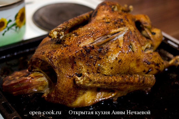 Рецепт из “Книги о вкусной и здоровой пище” и в ней он выглядит так: "Гусь, утка или индейка, фаршированные белым хлебом и печенкой. Но мне кажется, что и курица по этому рецепту получится чудной. Начинка, правда, для любителей печенки, она получается нежной и воздушной, очень вкусной. Времени на подготовку требует немного.