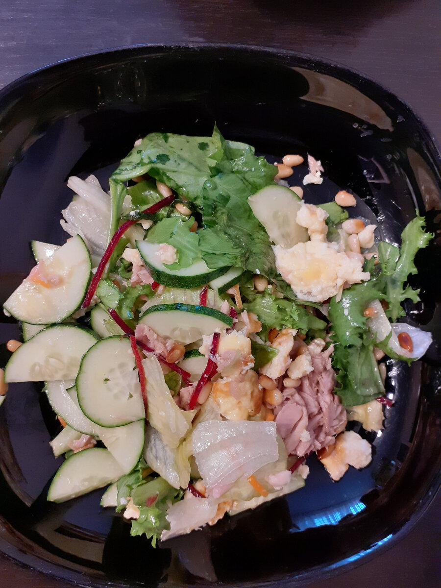 Всем привет! Рецепт этого салата придумал моя сестра. Я его полюбила искренне, можно сказать всей душой. Название у салата не было, но когда я ехала к ней в гости, сестра говорила, что приготовит наш любимый салат..ну этот зелёный. Вот поэтому салат так и назвали. В салате есть неизменных 4 компонента, а вот зелень может быть различная. Делюсь рецептом! Готовим омлет: яйца смешиваю с молоком , солим и выпекаем на сковороде до готовности. Омлет охлаждаем и нарезаем небольшими кусочками. Выкладываем в салатник. Далее открываем банку с консервированным тунцом, масло сливаем. Тунец выкладываем в салатник к омлету. Нарезаем салат айсберг или пекинскую капусту крупными кусочками. Перекладываем в салатник. Кедровые орешки обжариваем на сухой сковороде и добавляем в салат. Орехи можно заменить смесью семечек : тыквы, подсолнечника, кунжутные семечки и семена льна. Теперь добавляем микс из зелени. В этот раз приобрела микс, который содержит еще натертую свежую свеклу и морковь. Выкладывае