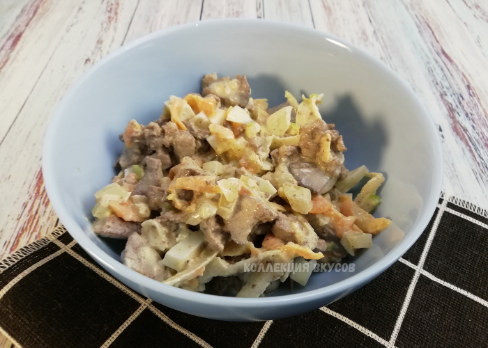 Вкусно, сытно и очень просто! Приветствую вас, друзья! Вы на канале "Коллекция вкусов", где вы всегда найдёте множество простых и вкусных рецептов на каждый день. ✅ Подыскиваете рецепт салата, которым можно и семью накормить на обед или ужин, и гостей удивить? Считайте, что вы его нашли!Сегодня делюсь именно таким рецептом — получается сытно, вкусно, а главное, готовится просто! Приступаем к приготовлению: Лук нарезаю мелкими кубиками, морковь натираю на крупной тёрке. Обжариваю овощи на сковороде с растительным маслом до мягкости и лёгкого золотистого цвета. Куриную печень очищаю от прожилок, мою, обсушиваю бумажными полотенцами, а затем обжариваю до готовности. Даю готовой печени остыть и нарезаю на небольшие кусочки. Отваренные заранее яйца нарезаю кубиками, яблоко натираю на крупной тёрке (яблоко лучше использовать зелёное и кислое). Все ингредиенты соединяю в салатнике. Солю и перчу по вкусу, заправляю сметаной, и можно подавать к столу! Такой салат я готовлю для повседневного о