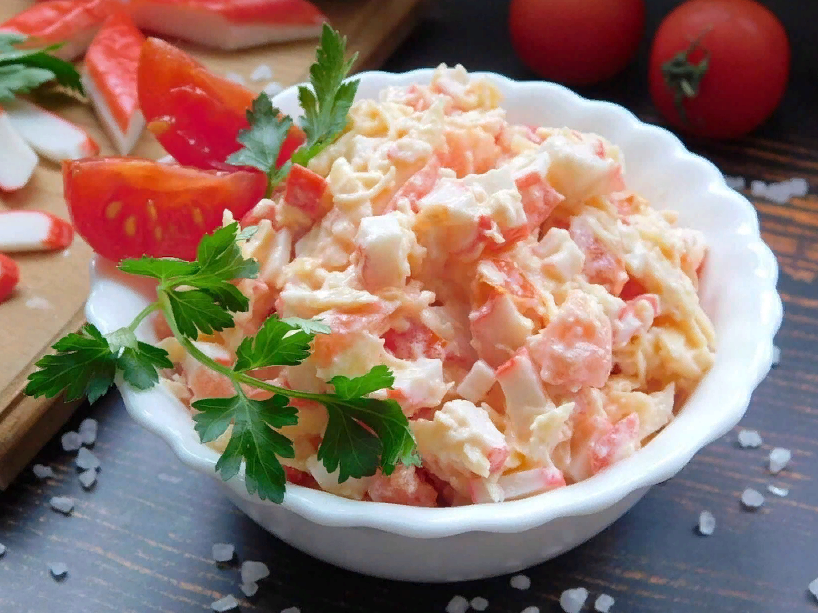 3. Крабовые палочки шинкуют кружками, помидоры – соломкой.