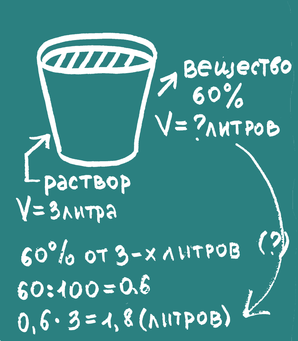 Привет! Сегодня подробно разберём задачу из второй части ОГЭ про растворы веществ, которая может легко запутать, но очень просто решается) Краткая запись решения ждёт вас в конце статьи. Смешали 3 литра 60-процентного раствора вещества с 7 литрами 10-процентного раствора этого же вещества. Сколько процентов составляет концентрация получившегося раствора? Разберемся в ситуации. Если смешали 3 литра раствора и 7 литрами раствора, то получился новый раствор, и его объём равен: 3 + 7 = 10 (литров) Общий объём раствора мы нашли, и осталось понять, сколько из этих 10 литров составляет наше вещество. Для этого сложим объём вещества в первом растворе с объёмом вещества во втором растворе. Но тут возникают первые проблемы. Объём вещества в двух растворах нам не сказан. Зато у нас есть его процентное содержание. А значит, и объём найти нетрудно. Чтобы найти процент от числа «Х», нужно 1) Поделить этот процент на 100 (чтобы перевести процент в часть). 2) Умножить получившееся число на то число, п
