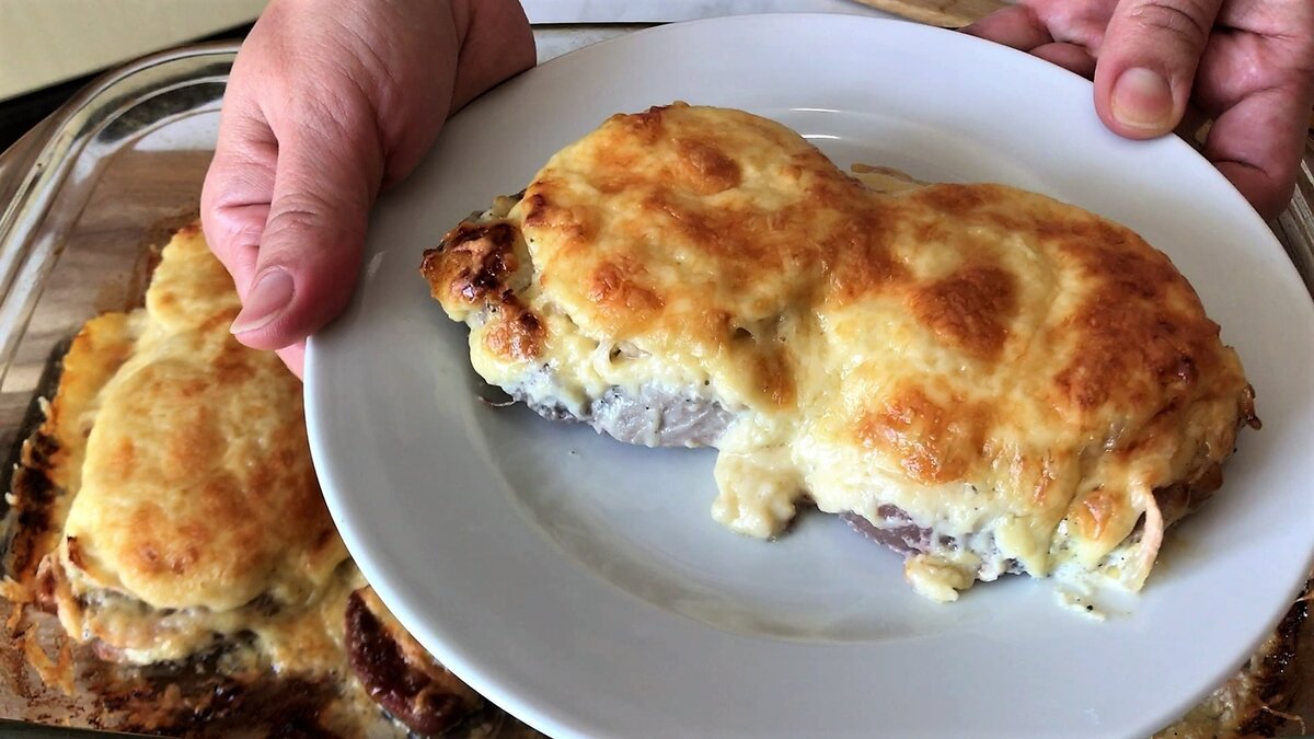 Всем Привет! Сегодня хочу поделиться рецептом обалденного блюда. Свиные отбивные под ананасами и сырной корочкой, от этого блюда гости будут в восторге. Мясо получается настолько нежное, что просто тает во рту. А ананасы придают незабываемый вкус + к тому же расплавленный сыр делает свое дело. В общем блюдо просто потрясающее, рекомендую к приготовлению на праздник, но и не только. Если вы по настоящему любите мясо и хотите удивить своих близких, обязательно приготовьте такие отбивные. ИНГРЕДИЕНТЫ: ПОШАГОВЫЙ РЕЦЕПТ. Первым делом нарезаем мясо на стейки. Для этого идеально подойдет шейная часть свинины, в ней больше жировых прослоек. У меня шейной части не было, я использовала окорок. Отбиваем мясо кухонным молотком. Перекладываем в противень для запекания. Сейчас нужно посолить и поперчить. Нам понадобится майонез, выдавливаем в майонез чеснок, хорошо перемешиваем и смазываем мясо майонезом. Далее равномерно выкладываем лук. Лук обычно я нарезаю кольцами или полукольцами. Сверх