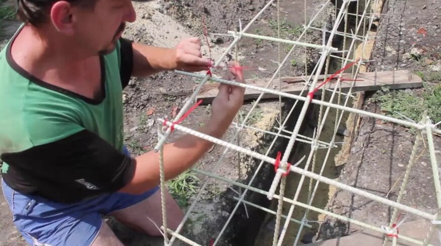 Друзья, я завёл новый канал. Пожалуйста, подпишитесь на него: нынешний канал со временем будет заброшен. Стеклопластик - хорошая альтернатива резко позолотевшей стальной арматуре, которую строители традиционно закладывают в фундамент уж лет как сто. При этом если какие-то 30-35 лет назад мы стальную арматуру варили, то сегодня в малоэтажном строительстве многие "не запариваются" и её вяжут. Что, в общем-то при определённых допущениях правильно. Но заголовок статьи пообещал рассказать, как вязать стеклопластиковую арматуру. Держу слово. Собственно, способов связать четыре продольных арматурины в два уровня всего 2. Первый способ - закупиться электротехническими пластиковыми хомутиками небольшой длины (100 мм хватит "за глаза"). Это самый популярный и простой способ вязки арматуры. Только не будьте, как Игорь (герой фотографии выше), вяжите стеклопластиковую арматуру в сплошных резиновых перчатках!