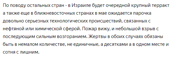 Можно считать что исполнилось. Ну - насчет технологических происшествий - там разбомбили нечто химическое или нефтяное, гдето в новостях мелькало, видел. ЖД катастрофы в США - пока не случилось, но вот мост развалился, неожиданно...но вполне закономерно. Ну..некоторые сказали что я пролетел....но не совсем. Казанцу инкриминирована всеж юридически статья 105, с особо тяжкими и опасным общественно способом, как террорист, в плане требований он себя не заявил. Да и 20е только кончается и данного предсказания как не печально я лично не снимаю. Карты по крайней мере при пересмотре - все равно показывают вероятность теракта в классическом понимании после 20го мая, ближе к 30му даже. И регион показывают север-северозападный ФО. С маньяками - прогадал, было парочка случаев, признаюсь, а вот криминальный авторитет действительно сегодня или вчера помер, правда в Абхазии. И да, его действительно пристрелили. САМАРА, 15 мая. /ТАСС/. Приволжское следственное управление на транспорте СК РФ организов