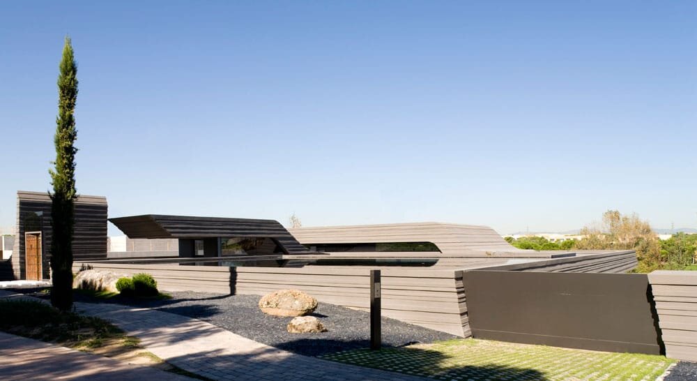 Эффектная современная резиденция в японском стиле от компании «A-cero» расположена в испанском городе Посуэло-де-Аларкон. Этот дом имеет уникальную архитектуру и оригинальный дизайн, он поражает своими масштабами и протяженностью площадей – его квадратура составляет более 1 700 метров. Особняк ломает представления об идеальных формах и организации пространства жилого здания. Дом состоит из кубических матриц и кривых, архитекторам проекта удалось найти то, что обеспечивает последовательный диалог между ними. Дом открыто демонстрирует свои рискованные стилизованные формы, а тонкая обработка кривых гармонично сочетается с их естественным контекстом, поддерживая четкий современный облик. В объемах доминирует горизонтальный вектор, линии которого накладываются друг на друга слоями, начиная с уровня цоколя. Создается впечатление, что дом естественным образом произрастает из этой земли, настолько органично он вписан в окружающий ландшафт. Архитектура особняка очень зрелищна – линии снаружи и