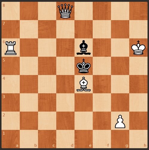 Автор задачи В. Сажин, 1974 год ( Первый почетный отзыв). Черный король в центре доски, напал на белого слона. Черные могут пойти слоном на d7, с целью затянуть игру. Но белые начинают и ставят мат в 2 хода. Решение смотрите далее. 1. Белые отводят слона на поле f3. 1. ................. черные идут слоном на f5. Другие варианты пишите в коментариях. 2. Белые - ферзь d6, мат. Следующая задача тут>>>>>