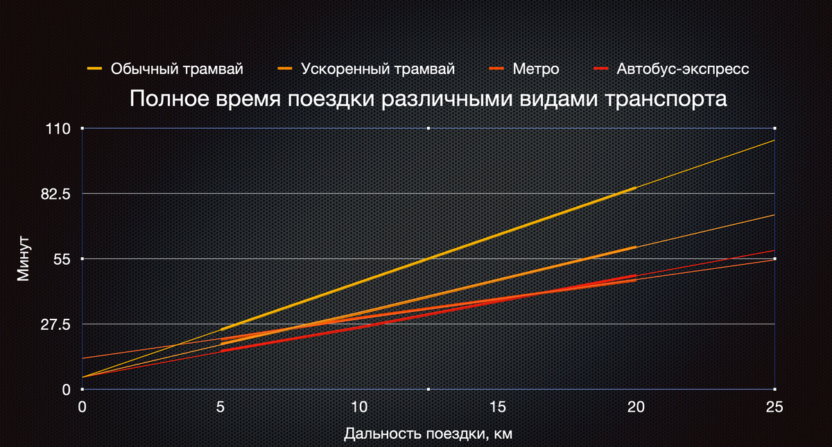 Получается, что до 4 км обычный трамвай будет быстрее метро, а до 7.5 км пассажир ускоренного трамвая опередит пассажира метрополитена.