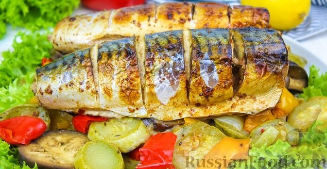 Скумбрия, запеченная с овощами Ингредиенты: * Скумбрия - 300 г *Морковь - 1 шт * Помидор - 1 шт. * Лук - 1 шт. * Лимон - 1/2 шт. * Соль, специи - по вкусу, Приготовление: Морковь очистите и натрите на крупной терке. Помидор бланшируйте и снимите с него кожицу, порежьте кубиками. Лук почистите и нарежьте полукольцами. Все овощи перемешайте вместе. Можно использовать и другие овощи для запекания со скумбрией. Например: сладкий перец или черешковый сельдерей, стручковую фасоль или зеленый горошек. По вашему желанию. Размороженную рыбу вымойте и выпотрошите. Голову и хвост можно оставить, а можно удалить. Еще раз промойте, просушите. Выдавить лимонный сок поверх рыбы, а также смазать соком рыбу внутри. Посолите (можно и без соли) и посыпьте приправами по вкусу. Пусть рыбка полежит примерно 20 минут для пропитки специями и лимоном. Часть подготовленных овощей положите в брюшко. Оставшиеся овощи положите на дно пакета (рукава) для запекания. Сверху уложите скумбрию. Завяжите конец пак