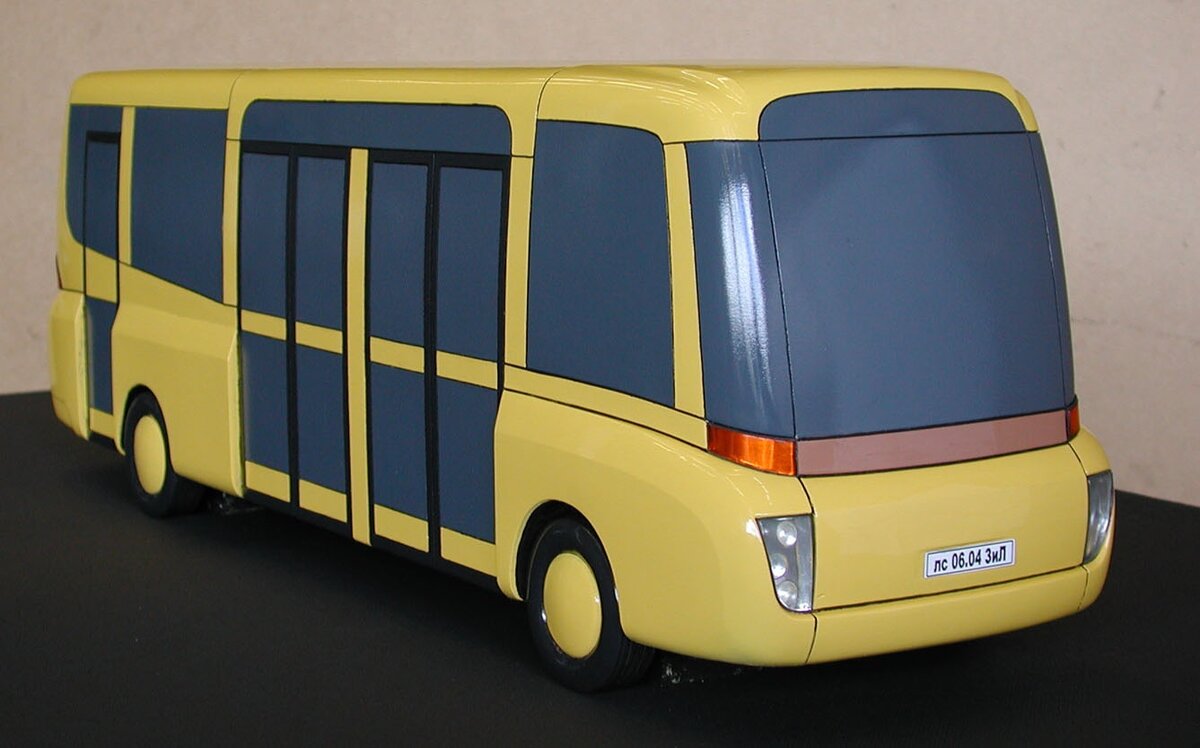 К концу 90-х годов всем вокруг стало понятно, что ЗиЛ находится в бедственном положении. Модельный ряд состоял из грузовых моделей устаревшей конструкции, разработанных еще во времена Советского Союза, а заказы на новую продукцию шли практически только от государственных структур. Руководство завода также прекрасно понимало проблему, поэтому в КБ шёл постоянный поиск новых ниш и новых идей. Сегодня я хочу показать вам несколько проектов автобусов, созданных в самом начале 2000-х годов. Начнём с проекта городского автобуса среднего класса. Он получился очень смелым и запоминающимся внешне. Первое, на что обращаешь внимание — это необычная компоновка дверей по правому борту. Практически в центре автобуса находится пара дверей, сдвинутых максимально близко друг к другу. Третья дверь — узенькая, одностворчатая — расположилась в заднем свесе автобуса. Над дверьми находится цифровое табло, на которое может выводиться номер маршрута и конечные пункты. Надо сказать, это довольно удобно для па