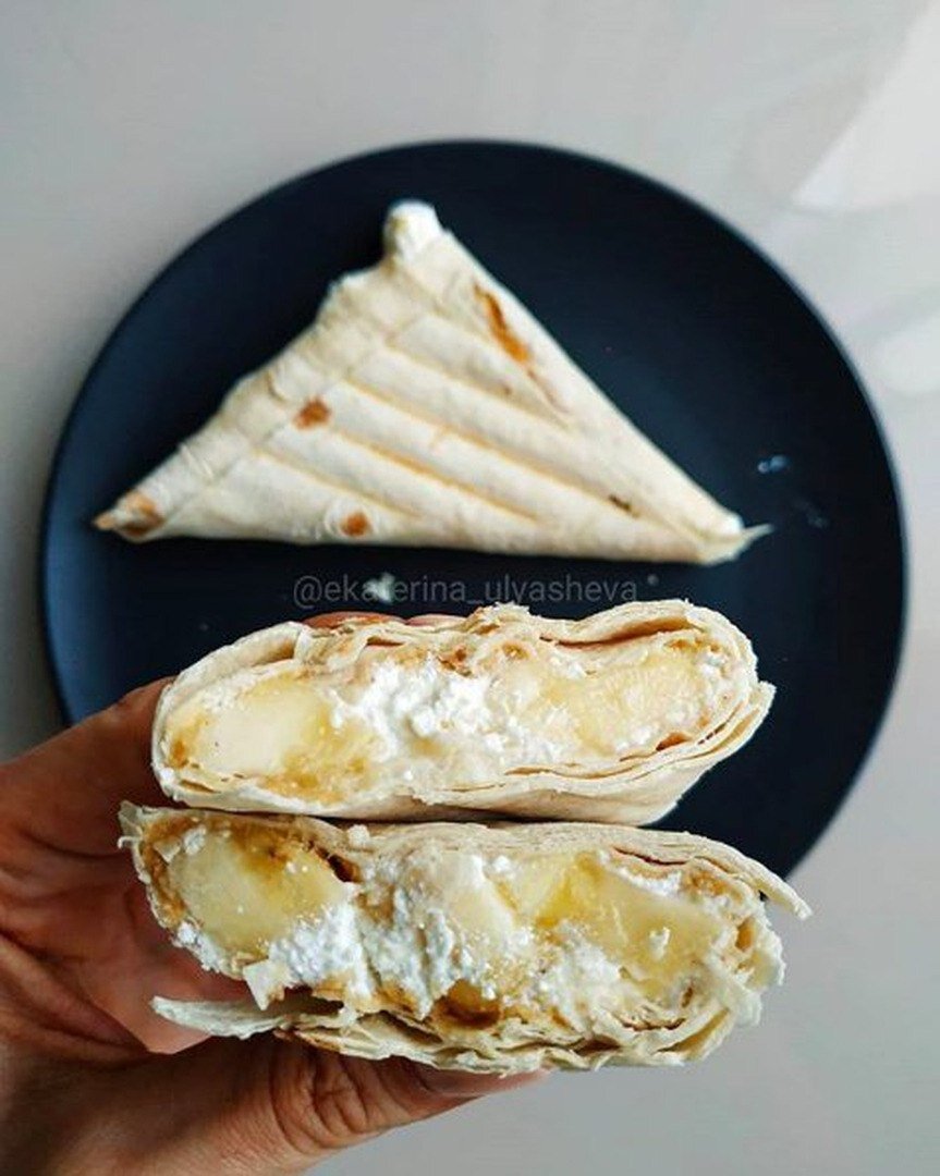 Заворачиваем уголки: лаваш+арахисовая+творог с бананом.