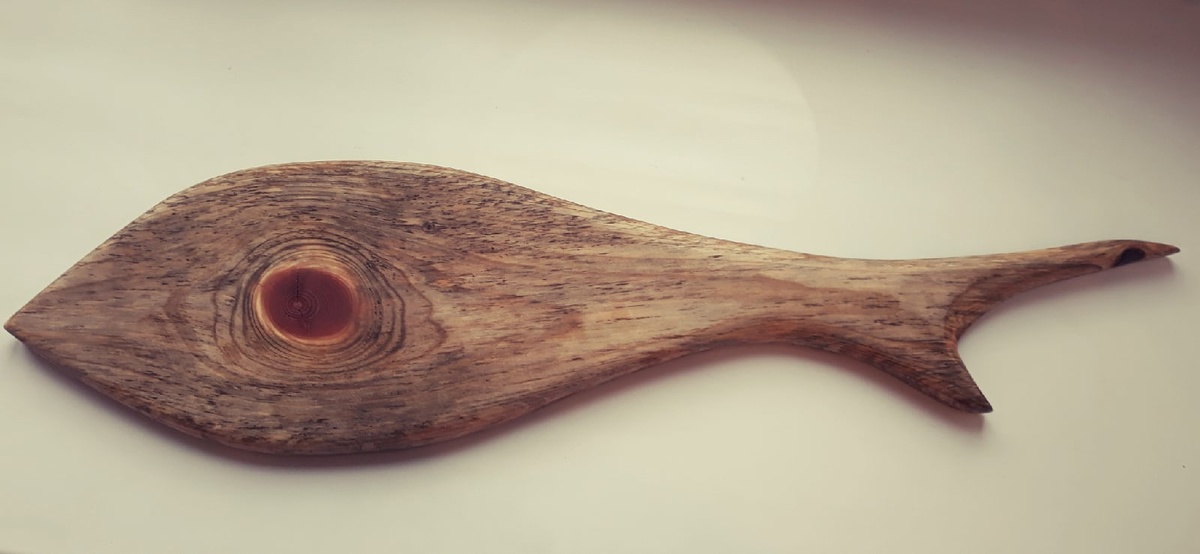 Захотелось порадовать жену и сделать ей необычную досточку для подачи блюд. В своих запасах нашел сухую доску 150 на 25. Выбрал именно такую с сучком, чтобы придать оригинальности и подчеркнуть структуру дерева. А форму рыбы мне подсказали древесные волокна, точнее их расположение (рисунок). По ним я и отрисовал контур и лобзиком выпилил заготовку. Далее с помощью орбитальной шлифмашинки и наждачки разной зернистости (80-120) отшлифовал поверхность доски. Также на лицевой стороне скруглил края. Ну и осталось защитить само дерево от влаги ну и подчеркнуть натуральность древесины. Для этого я воспользовался обычным пищевым льняным маслом. Вот такая досточка для подачи получилась! Также её можно использовать в качестве разделочной доски или в качестве декора на кухне. Жена была очень довольна такому подарку!