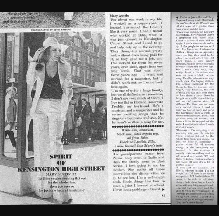 Я из большой семьи, но мы как-то все разбрелись. Я вижу немногих из них. Я живу в квартире на Холланд роуд с Фредди, моим парнем. Он музыкант и композитор, он пишет потрясающие песни, которые он поет за большим пианино, которое у нас есть. (добавлю от себя: В 1973 году 13 июля 1973 года группа Queen выпустила дебютный альбом Queen, ставку музыканты сделали на песню Keep Yourself Alive, выпустив её дебютным синглом в июле 1973. Этот альбом записывался параллельно с учёбой участников группы в течение двух лет — в те моменты, когда студия звукозаписи была свободна. После выхода альбома группа отправилась в турне в качестве разогревающей группы)