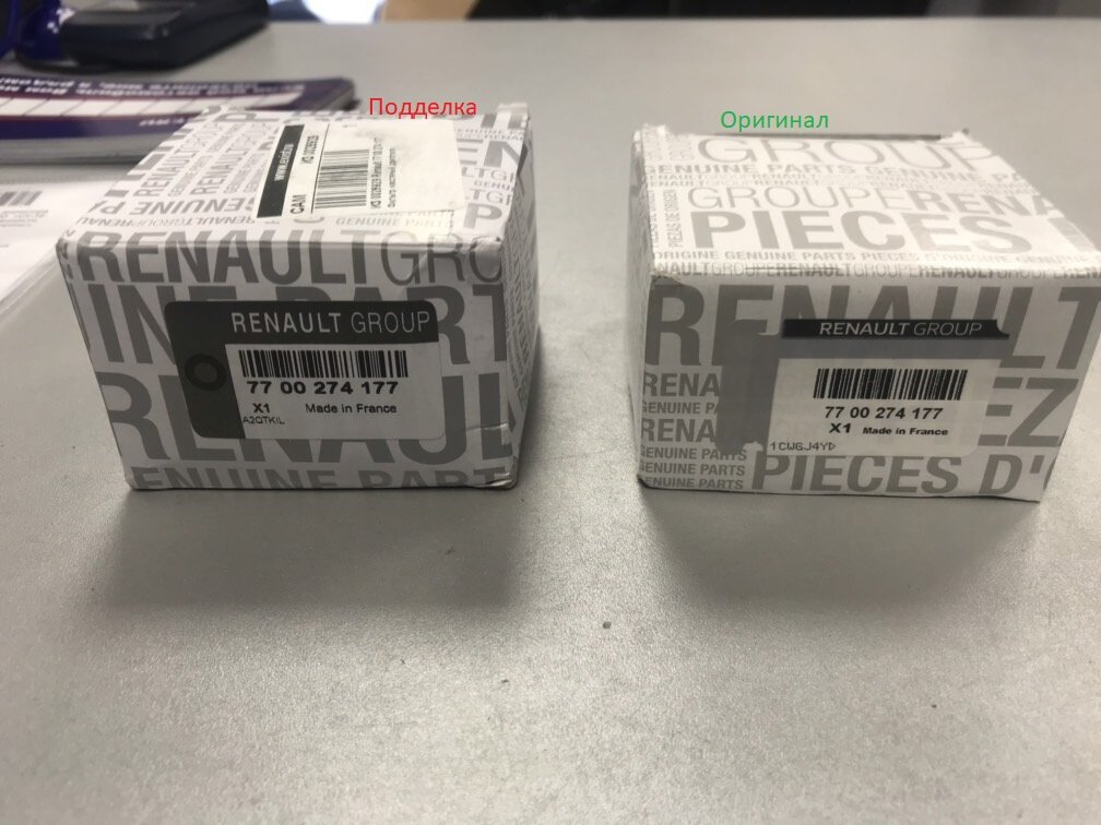 3) Обратим внимание на этикетки - на обеих написано Renault Group, артикул, страна производства - Made in France. Но шрифты, цвет, штрихкоды и характерный кружочек на подделке тоже никак не относятся к оригиналу.