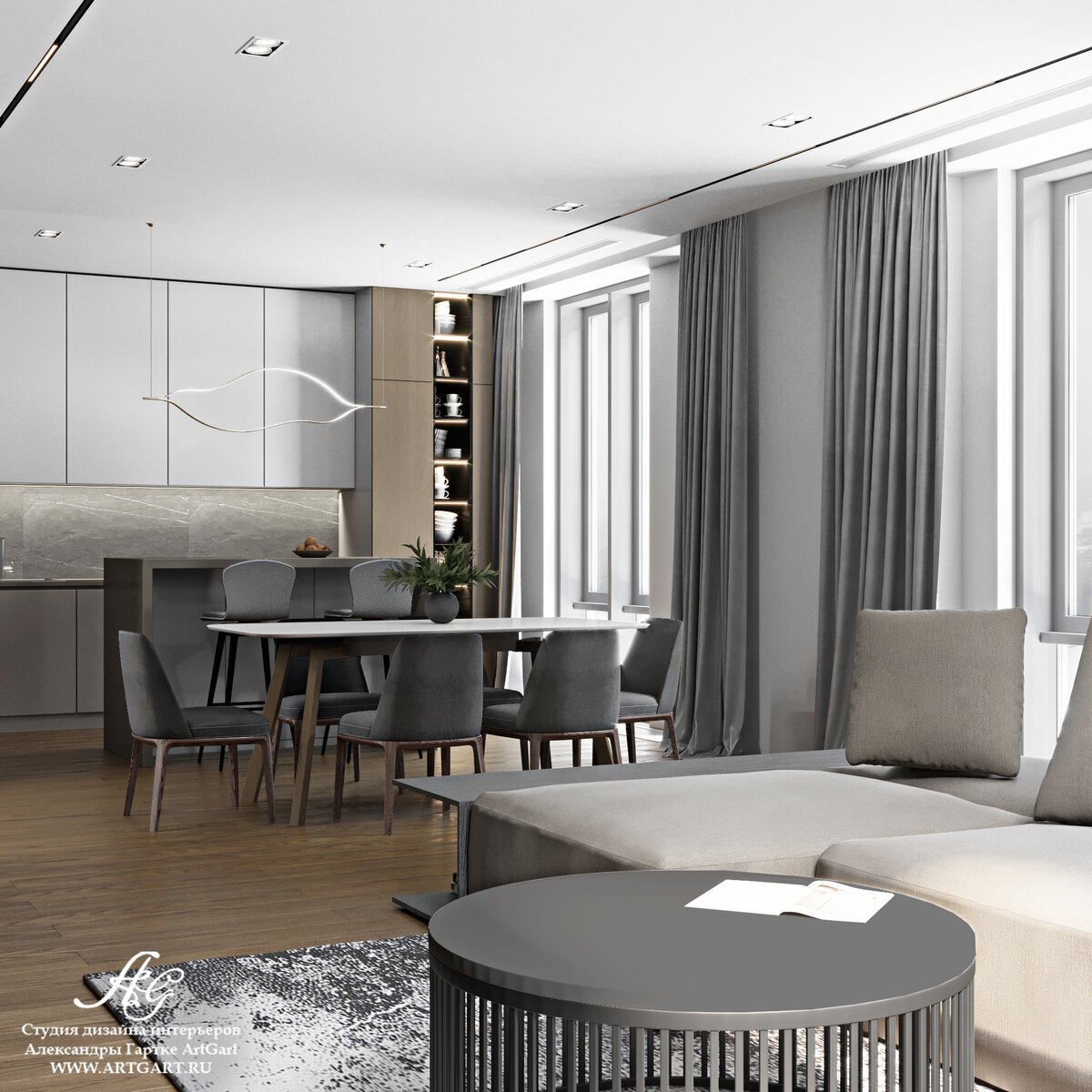 Квартира 165 квадратных метров на тридцатом этаже в ЖК дом на Мосфильмовской #домнамосфильмовской165м Общая площадь кухни-гостиной 55 метров, в помещении четыре окна, которые выходят на две стороны. Помещение просторное, и перед нами стояла задача обустроить гостиную зону так, чтобы можно было наблюдать вид из всех окон, а стоит заметить, что вид просто роскошный! Москва-Сити, гольф-клуб, городской пейзаж и зеленые просторы города! Поэтому диван мы подобрали трехсторонний. Две стороны позволяют любоваться видом, а третья наслаждаться просмотром кино. Здесь же располагается просторный обеденный стол на шесть персон и кухонный остров. Кухня угловая, хотя на самом деле ее части разделяет вентиляционный короб. Здесь он был изначально, и это большое везение, потому что такие конструкции нам часто приходится возводить, чтобы добиться этого эффекта разделения. Одна часть с колоннами оснащена холодильником, винным холодильником, духовкой и шкафом для хранения. Места для хранения на этой