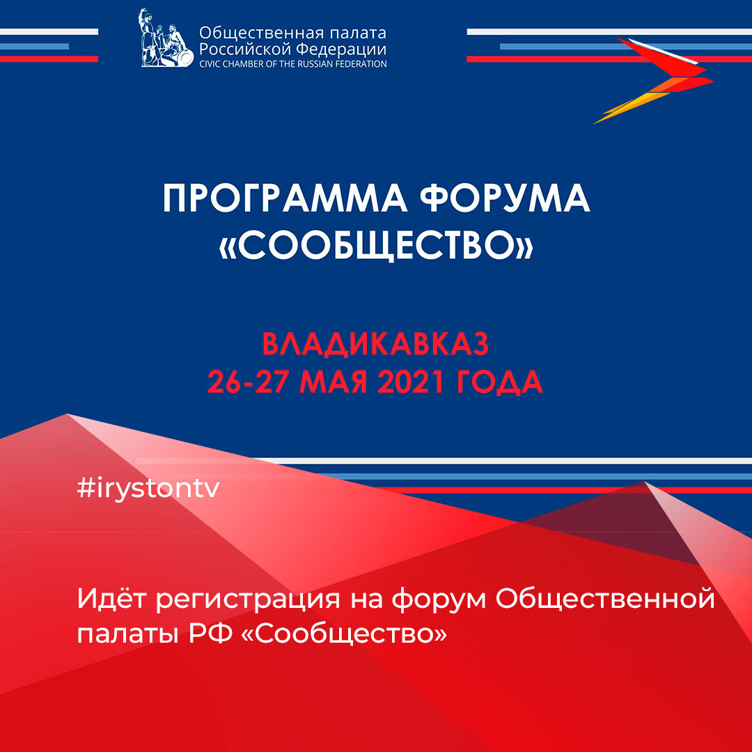 Идёт регистрация на форум Общественной палаты РФ «Сообщество». Форум пройдёт 26-27 мая во Владикавказе. Форум «Сообщество» Общественной палаты (ОП) РФ состоится в очном формате 26–27 мая в столице Республики Северная Осетия — Алания — Владикавказе. Тема предстоящего форума — «Общественный контроль — инициатива, участие, результат!». Программа форума рассчитана на два дня и включает в себя такие форматы мероприятий, как секционная дискуссия, проектная сессия, мастер-класс, круглый стол, питчинг-сессия, семинар, тренинг и рабочее совещание. Упомянутые форматы мероприятий пройдут в рамках пяти секций: «Общественный контроль», «Региональные приоритеты», «Некоммерческий сектор», «Туризм на Северном Кавказе» и «Социальное проектирование». Помимо прочего, в рамках форума будет работать экспозиция лучших практик НКО и выставка социально значимых проектов, реализованных в Северо-Кавказском федеральном округе. Также во второй день форума состоится церемония чествования волонтёров. Более детально