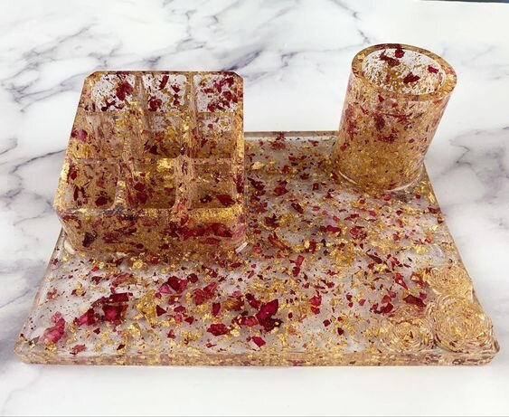 Рано или поздно любой человек, кто взял в руки смолу задумается о переходе от создания сережек из двух капелек материала к созданию чего то более масштабного. Кто то ваяяет потрясающие диорамы, кто то картины- а я предпочитаю делать что то, что можно использовать в быту. Так что я собрала для вас примеры того, что можно сделать из смолы без сильных технических сложностей и потом пользоваться в обычной жизни. Все изображения взяты из свободного доступа- я не присваиваю себе авторство работ, а лишь привожу для ознакомления. 1. Подставки. Первое, что приходит в голову это всевозможные подставки. Например, полки для красок, органайзеры для мелочей, карандашницы и прочее. Форм для этих изделий куча- и на ли экспресс и в магазинах РФ. Технология работы проста- придумываешь дизайн, выбираешь форму и заливаешь. Никаких подвохов и секретов. 2. Костеры и сервировочные доски. Закидайте меня закипевшей смолой, но я не люблю практическое применение подставок под кружки! Однако, очень много людей