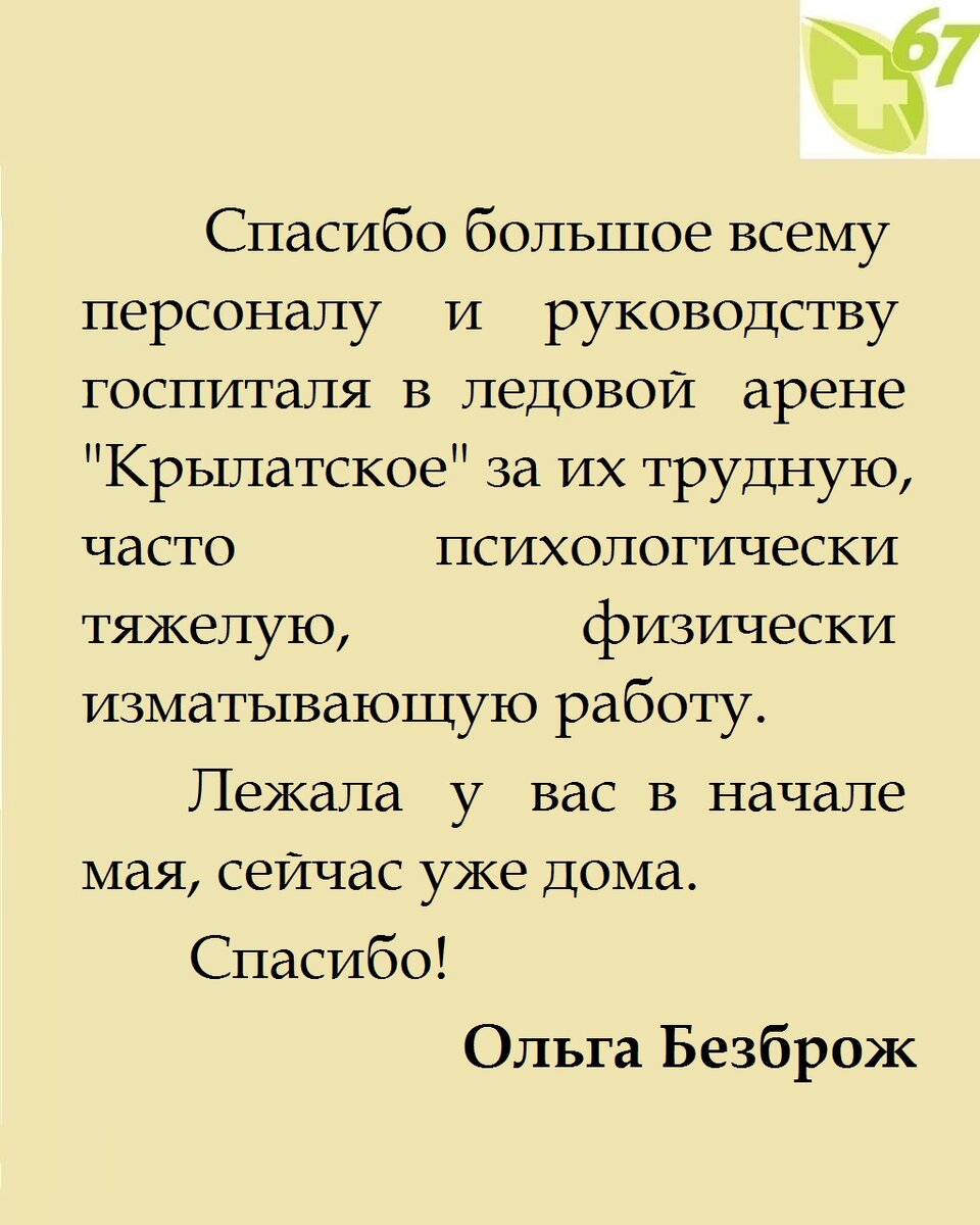 Мы продолжаем получать благодарности от пациентов госпиталя в Крылатском и их родных. Большое Вам спасибо за тёплые слова! Берегите себя - соблюдайте меры профилактики и не откладывайте прохождение вакцинации. Узнать подробности о вакцинации от COVID-19 и записаться на прививку можно на сайте MOS.ru по ссылке: https://www.mos.ru/city/projects/covid-19/privivka/ Будьте здоровы! #Москва #Крылатское #госпиталь #врачи #медсестры #больница #гкб67 #COVID #коронавирус #спасибо