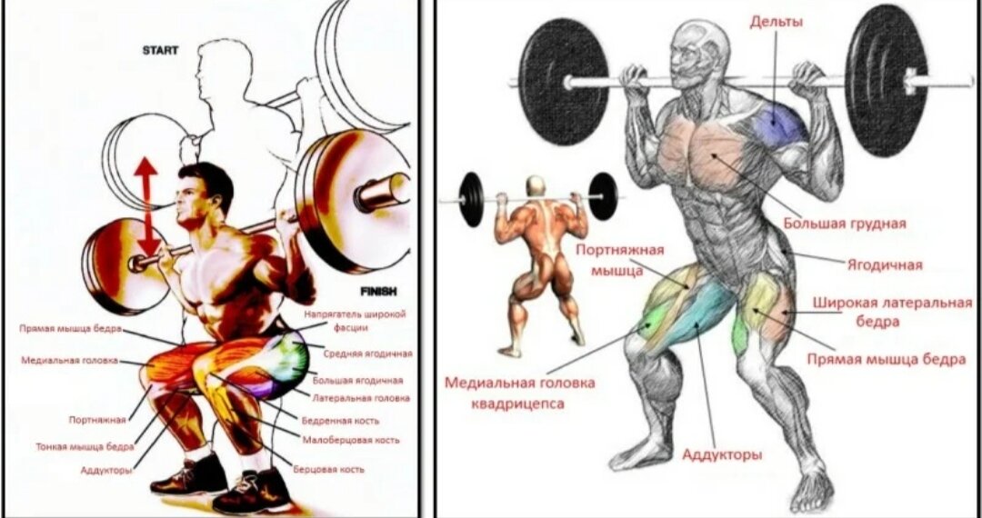 Начнём с того что во время приседа работают разные группы мышц: Техника выполнения: постановка ног должна соответствовать ширине плеч,носки смотрят строго вперёд. Хват:закрытый,руки должны располагаться симметрично от центра. Положение шеи и глаз:во время приседа надо всегда смотреть выше горизонта. Исходное положение и движение вниз: Глубина приседаний : разрешается выполнять упражнение до поралельного положения ягодиц относительно пола.