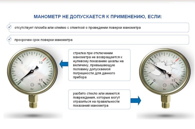 разбито стекло или имеются другие повреждения манометра, которые могут отразиться на правильности его показаний.