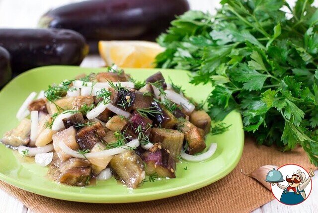 Возьмите 3 средних баклажана, нарежьте на крупные кубики - 2см. Обваляйте в смеси муки, крахмала и соли. Обжарьте овощ со всех сторон до румяной корочки, выложите в салатник. Пару сочных луковиц нарежьте мелкими перьями, слегка присолите и засыпьте луком готовые баклажаны. В чашке заведите вилкой маринад. Яблочный уксус - 2ст. ложки, щепотка сахара, 1ч. ложка соевого соуса, вода - 3ст. ложки. Молотый черный или красный перец - по желанию. Полейте закуску маринадом, аккуратно перемешайте. Подавайте к столу, щедро посыпав баклажаны рубленной зеленью - укропом, петрушкой, кинзой. Приятного Вам аппетита!