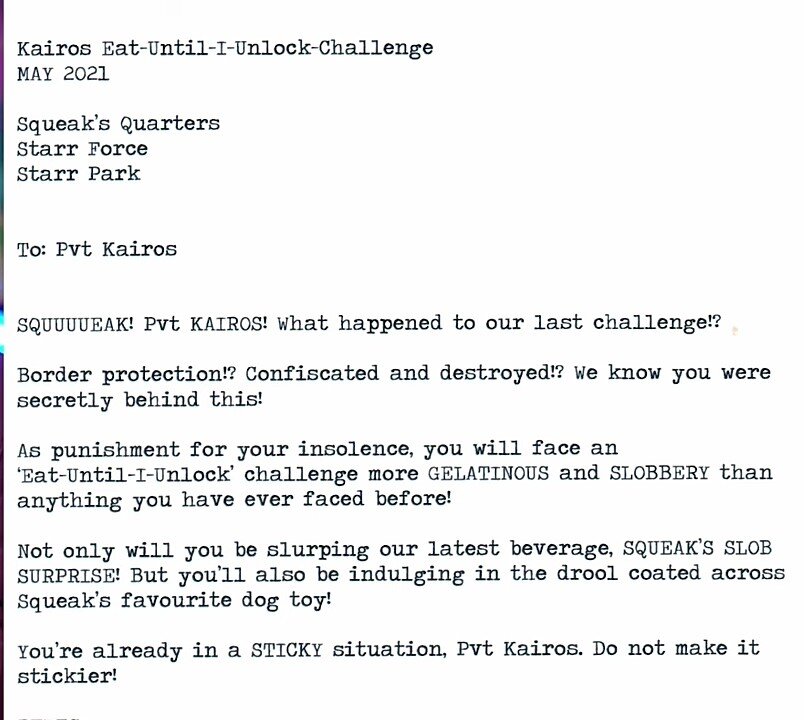 21 мая одному из официальных зарубежных ютуберов по Brawl Stars Kairos прислали интересную и странную посылку от Supercell в честь выхода Скуика 20 мая. В посылке находился челлендж для него. Начало: В посылке в первую очередь находилось письмо с объяснением,что это все такое. По письму видно, что отправили посылку от лица Скуика Перевод письма: Испытание Кайросу Ешь-пока-не-разблокируешь МАЙ 2021 г. Квартал Скуика Старр Форс Старр Парк Кому: Pvt Кайрос СКУУУИК! Pvt КАЙРОС! Что случилось с нашим последним испытанием!? Пограничная охрана!? Конфисковали и уничтожили!? Мы знаем, что вы втайне за этим стояли! В наказание за вашу наглость вы столкнетесь с проблемой «Ешь-пока-не-разблокируешь», более ЖЕЛАТЕЛЬНОЙ и ЖЕСТКОЙ, чем все, с чем вы когда-либо сталкивались раньше! Вы будете не только глотать наш последний напиток, SQUEAK'S SLOB SURPRISE! Но вы также будете баловаться слюной, покрытой любимой игрушкой для собак Скуика! Вы уже в КЛЕЙКОЙ ситуации, рядовой Кайрос. Не делайте его липче!