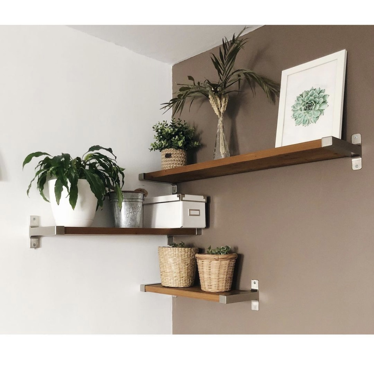 Но я⠀вспомнила, что дома есть крепления от икеевских полок Грангульт (фото в карусели). И вот под них я подбирала доски. На 2 полки крепления были, а на третью пришлось докупать. 700 ₽/комплект. И как назло за несколько лет размеры их поменялись на 1 см в бОльшую сторону. Соответственно на третьей полке получился зазор в один см. Повесили ее повыше и оставили зазор у стены и этого совсем не видно. ⠀