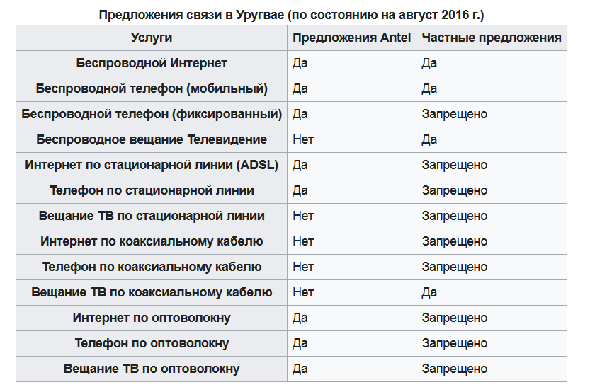 Компании Antel была предоставлена монопольная власть над большинством видов коммуникационных услуг в Уругвае :