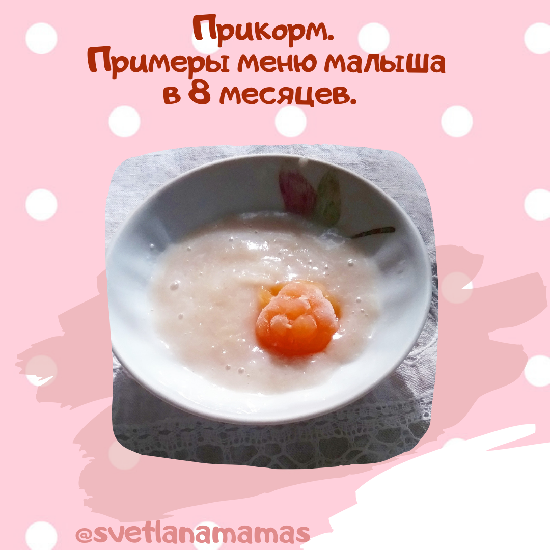 Премерное меню прикорма малыша в 8 месяцев. ⚜2 варианта меню. 1.Завтрак:Гречневая каша с пюре чернослива+сливочное масло. 2.Обед: Пюре из картофеля и моркови+оливковое масло+мясное пюре. Дополнительно: микродозы свежих фруктов: тертое на мелкой терке яблоко. 1.Овсяная каша с пюре из черники+сливочное масло 2. Пюре из кабачка и моркови+оливковое масло+пюре из индейки. Дополнительно в течение дня: микродозы банана 1.Кукурузная каша с пюре из тывы и яблочного пюре+сливочное масло 2.Пюре из брокколи и картофеля+оливковое масло+отварная морская рыба ( минтай или треска) Дополнительно: микродозы груши ⚜2 вариант меню. 1.Завтрак: Овсяная каша+ сливочное масло+микродозы свежих фруктов ( яблоко) 2. Перекус:Фруктовое пюре из ранее введеных ( пюре из груши) 3. Обед: Пюре из батата + оливковое масло+ пюре из телятины 🏵 1.Завтрак:Гречневая каша +сливочное масло+ микродозы свежих фруктов ( банан) 2.Перекус: Фруктовое пюре из черники и яблока 3. Обед: Пюре из картофеля и тык
