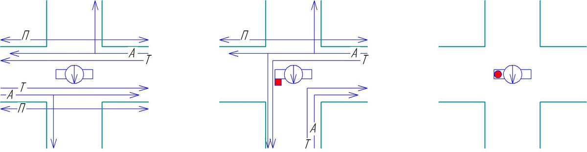 со стороны левого и правого бока разрешено движение трамваю прямо, безрельсовым транспортным средствам прямо и направо, пешеходам разрешено переходить проезжую часть;