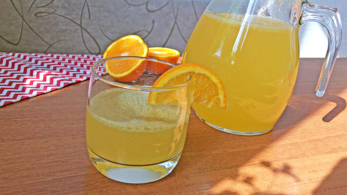 - В кувшин влить апельсиновый сок, добавить лимонный сок, влить сироп и газированную воду, хорошо перемешать.Поставить в холодильник на 1 час.