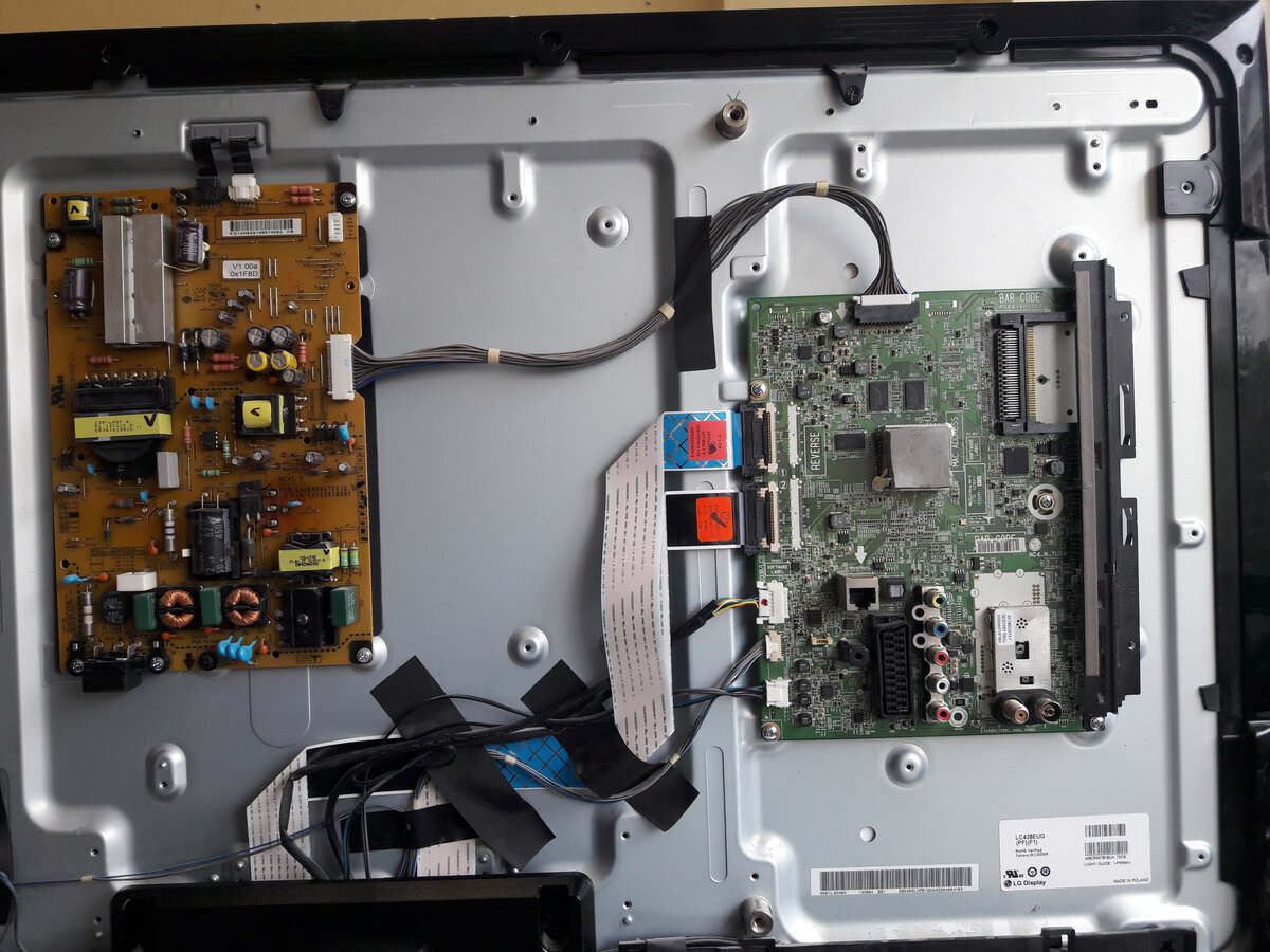 Всем здравствуйте! Рад новой встрече на канале! Сегодня у нас на ремонте телевизор LG42LA660V-ZA, с заявленной неисправностью не включается после удара молнии. А так-же вместе с ним пришли в негодность тв приставка от Ростелекома и Sony Plyastation-4. Но пока нам принесли телевизор, остальное, возможно, подвезут позже. Ну что-же начнём! Фото внутренностей ниже. Блок питания eax64905701 2.3 ремонт описан здесь , но данном случае он исправен. Материнская плата LD33/LC33B/LE33B EAX64797003(1.2) Сначала мы проверяем блок питания на наличие выходных напряжений. И как ни странно у нас имеется на входе 3,5 вольта.( Обычно при грозе зачастую выносит именно блок питания.) Дальнейшим действием мы проверяем весь блок на работоспособность методом запуска в автономном режиме. Как блок eax64905701 2.3 запустить в автономном режиме я описывал при ремонте такого-же в ЭТОЙ статье. Блок питания и подсветка у нас оказались полностью исправны. Осталось разобраться с материнской платой. И вот тут са