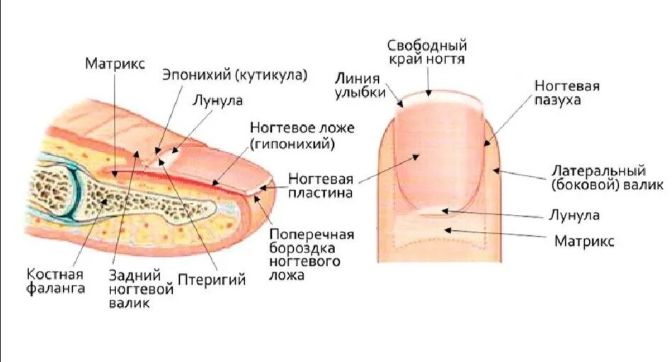 Ногти - это роговые эпителиальные придатки кожи. Эпителий ногтевого ложа имеет такое же строение, как ростковый слой эпидермиса. Ногтевая пластина образована роговыми чешуйками, содержащими твёрдый кератина. Рост ногтя происходит медленно со скоростью около 1 мм в неделю за счёт пролиферации клеток матрицы (онихобластов) ногтя. После размножения эти клетки дифференцируются и подвергаются ороговению. Ногтевая пластина состоит из самого прочного белка беттакератина. Кроме белка, в состав ногтевой пластины входят сера, фосфор, кальций, вода, тяжёлые металлы - мышьяк, фосфолипиды и холестерин. Ногти в отличие от кожи, очень хорошо впитывает воду, большое количество масел и жиров. Состоит ноготь из роговой пластины, лежащей на ногтевом ложе, у основания и с боков ограниченное кожными складками - ногтевым и валиками. В ногтевой пластины различают корень, тело, край. Корень ногтя - это задняя часть ногтевой пластины - лунка ногтя (лунула), здесь находится ростковый слой - матрица ногтя.