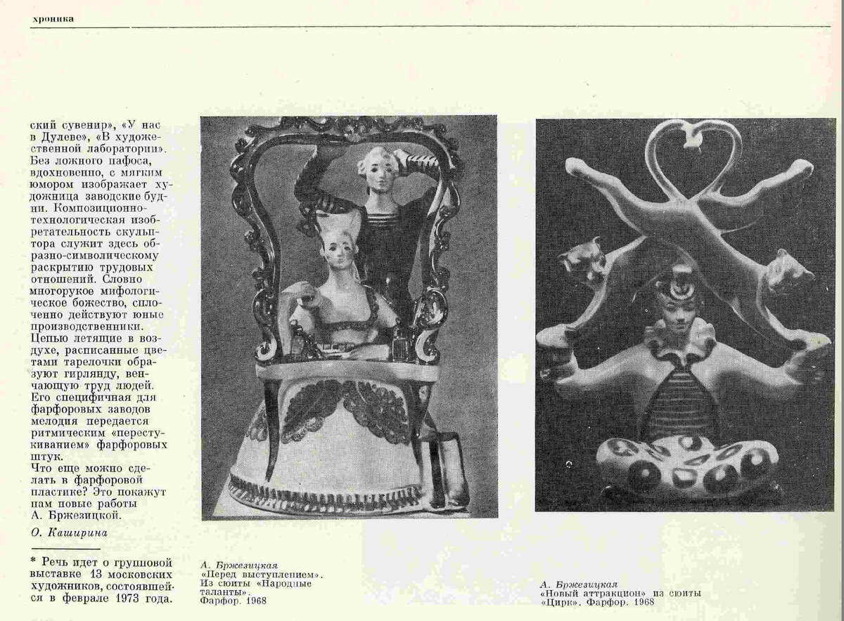 Атмосферой нарядной праздничности и душевного подъёма встречала зрителя фарфоровая скульптура А. Бржезицкой на выставке в Доме художника [Речь идёт о групповой выставке 13 московских художников, состоявшейся в феврале 1973 года]. В ней целая красочная симфония, где звучные аккорды цвета и фанфарные всплески золота сопровождают сияющую белизну фарфора.