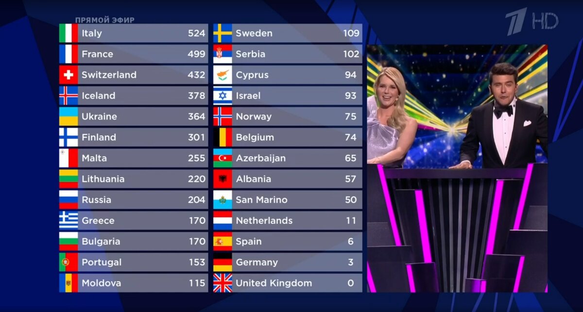 В Роттердаме завершился финал музыкального конкурса «Евровидение». Победителем конкурса в этом году стали представители Италии — рок-группа Måneskin, которая исполнила песню «Zitti e buoni». На втором месте расположилась певица Барбара Прави из Франции, а замкнул тройку лидеров представитель Швейцарии Джон Мухарремай. Певица Манижа, которая представляла Россию на «Евровидении», заняла лишь девятое место. Конечно это не самый лучший результат, но зато Манижа смогла войти в десятку. Тем не менее, подведение итогов голосования телезрителей не обошлось без довольно курьезного инцидента. За Великобританию, Германию, Испанию и Нидерланды зрители отдали… вы не поверите, ноль голосов. Лица ведущих конкурса в этот момент говорят все сами за себя: Похоже, что они не могли поверить в то, что сразу четыре страны остались без баллов. Более того, Великобритания набрала в целом ноль баллов. То есть за нее не отдали ни одного голоса ни профессиональное жюри стран, ни телезрители. Это самый слабый резу