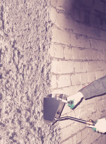 Когда все готово, включаем оборудование, зачерпываем раствор в ковш и проходимся по стенам.