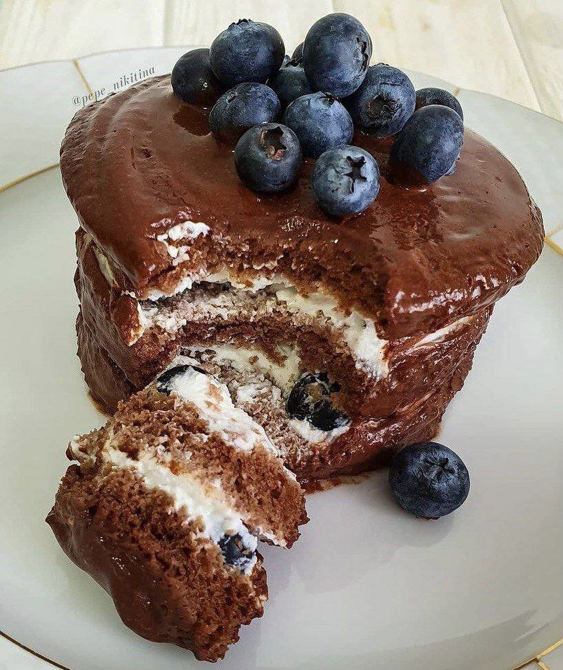 Бисквит: 👉Яйцо - 1 шт 👉мягкий творог 5% - 60 гр 👉Какао – 5 гр 👉Овсяные хлопья перемолотые (овсяная мука) - 25 гр 👉Разрыхлитель - 1/2 ч.л. 👉Подсластитель фитпарад 1 саше Крем: 👉Мягкий творог 5% – 100 гр 👉Подсластитель фитпарад 1 саше Глазурь: 👉Какао - 10 гр 👉Pяженка 4% - 40 мл 👉Подсластитель фитпарад 1 саше 👉Ягоды для украшения Смешать все ингредиенты для бисквита. Перелить в форму для микроволновки. У меня диаметром 10 см. Поставить в СВЧ при 800 Вт на 3 минуты. Дать остыть. Разрезать на 3 коржа. Для крема смешать мягкий творог с подсластителем, я добавила голубику. Смазать первый корж 1/2 крема. Накрыть вторым коржом и выложить остаток крема. Накрыть третим коржом. Смешать все ингредиенты для глазури. Смазать верх тортика и бока, украсить. Убрать в холодильник на 3 часа, лучше на ночь